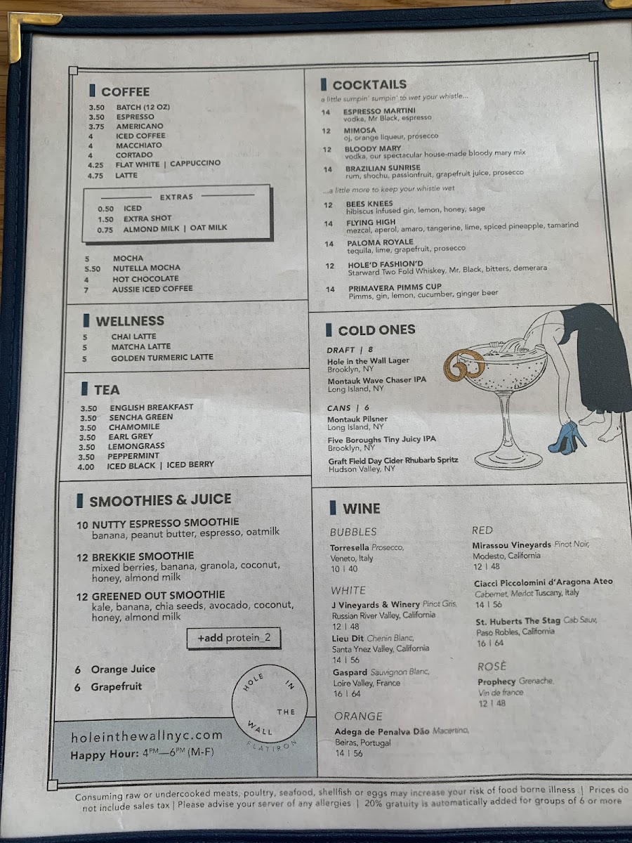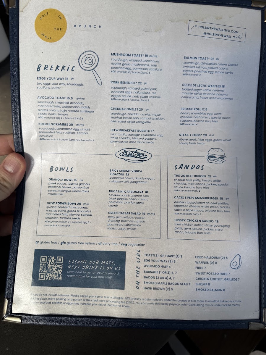 Welcome to Hole In The Wall - Murray Hill, a charming eatery nestled at 445 E 35th St, New York, NY. This hidden gem is quickly becoming a favorite among locals and visitors alike for its delightful, flavor-packed menu. Known for its enticing brunch options, patrons rave about the Pulled Pork Benedict and Wild Mushroom Toast, each dish artfully combined with unique flavors and fresh ingredients.